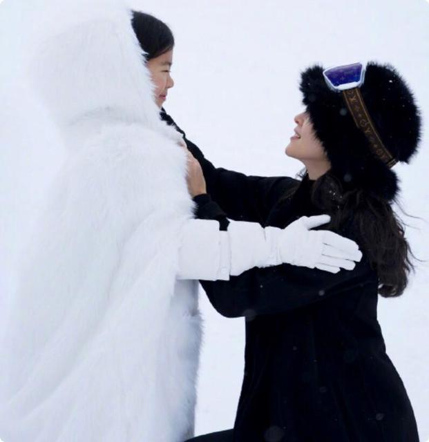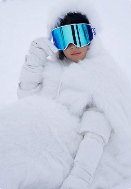 相片中,醒醒穿着一件白色长款羽绒服,与雪融为一体,一张精致精致的脸不施粉黛,却可爱生动。