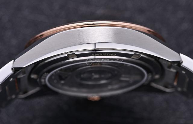 刚性表壳侧面经过精细磨砂打磨抛光,视野来到正面,还可以看到打磨抛光的表耳,18K 5N 玫瑰金制成的窄表圈,给手表带来了丰富的视觉效果。