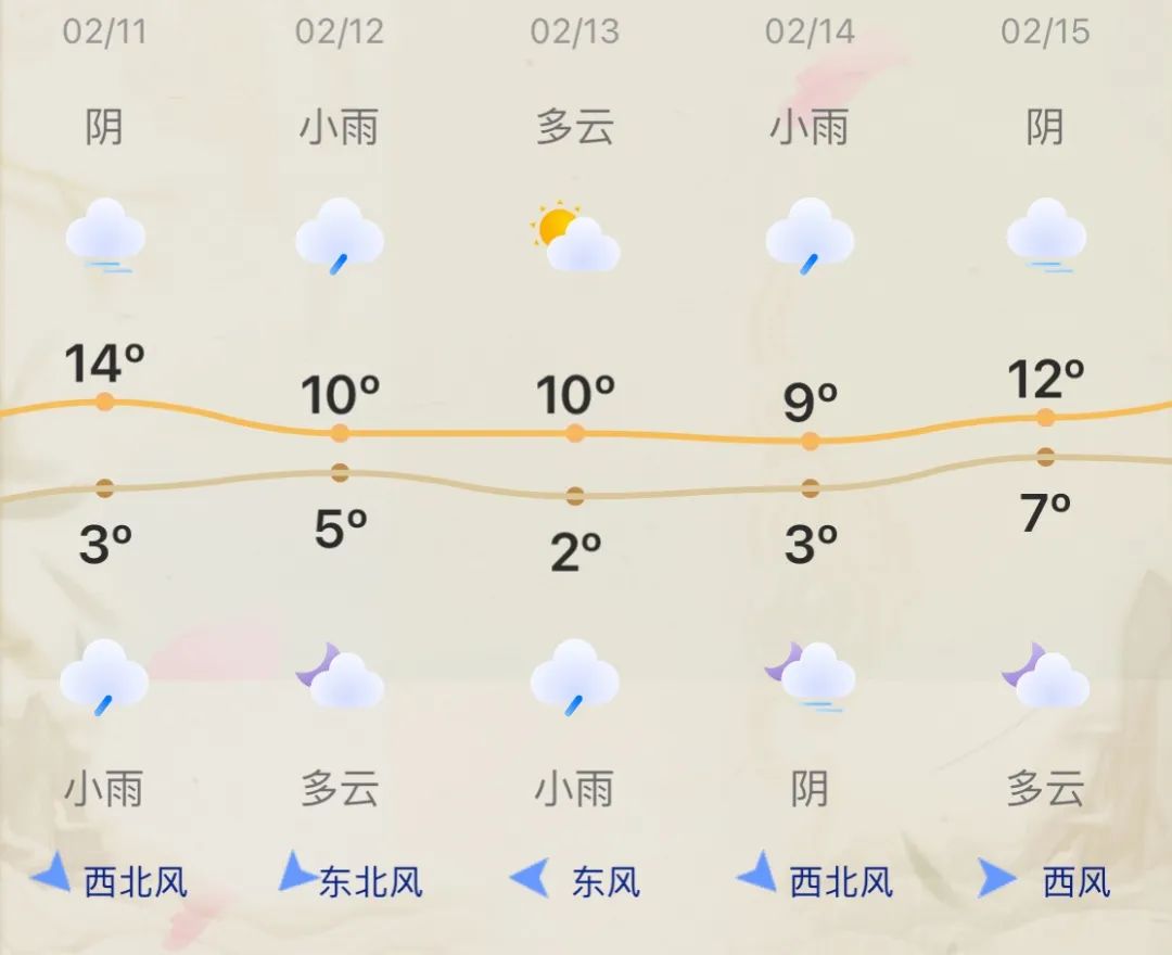 据苏州气候消息,预计本周苏州的主要降水过程将出现在12日白天和13日下午到15日白天,11日晚上将会出现弱降雨。气温方面,本周有两个冷空气过程,每周最低气温为1~2℃,14日上午出现。请根据温度的变化及时添加衣物。