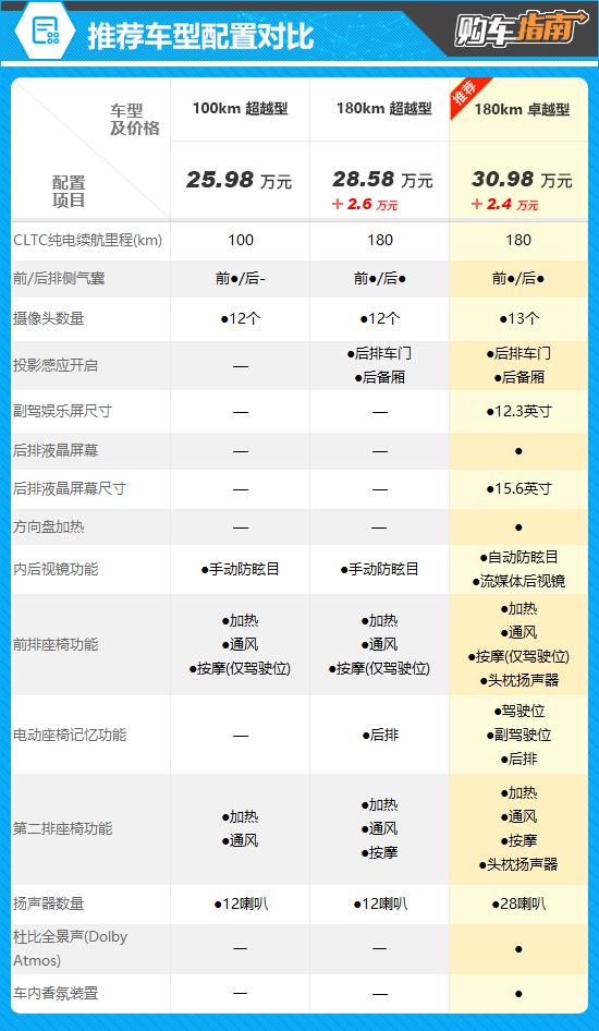 这次推荐的是价格 30.98 万元的 180km 优秀的型号,通过配置对比可以看出,与低一级车型相比,推荐车型在舒适性和多媒体配置上有所提升,增加了新的。 12.3 英尺副驾娱乐屏,后液晶屏,方向盘加热,第二排座椅头枕音箱等。同时,对 MPV 对于车型而言,第二排乘客的感受更为重要,推荐车型还配备了车型。 15.6 后排液晶屏的英尺,在驾驶时还能提供更丰富的娱乐体验。另外,扬声器的数量也是如此 12 一个扬声器升级为 28 扬声器,尽管价格上涨 2.4 一万元,但是新增设备绝对物有所值,可以带来更好的用车体验。