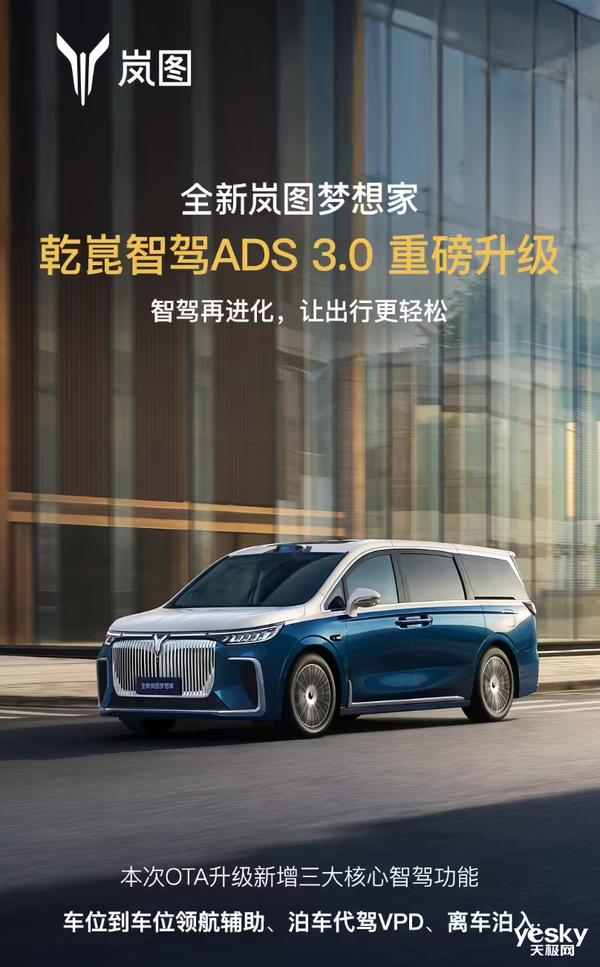 12 月 27 日,全新岚图梦想家同步推送乾坤智驾驶。 ADS 3.0 升级,新增车位到车位领航辅助,停车代驾 VPD、离车泊入三大核心智能驾驶功能,智能对齐行业领先第一水平,同时率先拉响高档新能源。 MPV 智能攻坚战,客户体验完全打满。