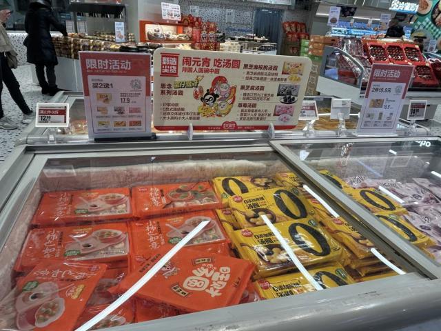 今年,在保留黑芝麻、花生、豆沙等其它口味的基础上,盒马创新推出芋泥栗蓉、榴莲草莓等新风味汤圆。造型设计也是独一无二的,将美好的寓意融入到传统美食中。盒马中信泰富万达店主管占珊珊介绍:“在选择钱的时候,我们更注重饺子的‘外观’,寓意好、造型独特的饺子,比如‘柿子开心’,销量很好。今年,与蛋仔派对合作的汤圆系列新产品也在盒马推出,黑芝麻口味非常流行。“根据店面统计,近期汤圆销量同比增长约为 40%。