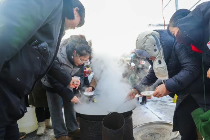 美食区也很热闹。冻柿子、甜美诱人的冰糖葫芦、热气腾腾的铁锅炖等特色美食令人垂涎。游客驻足品尝,感受正宗的东北风味。