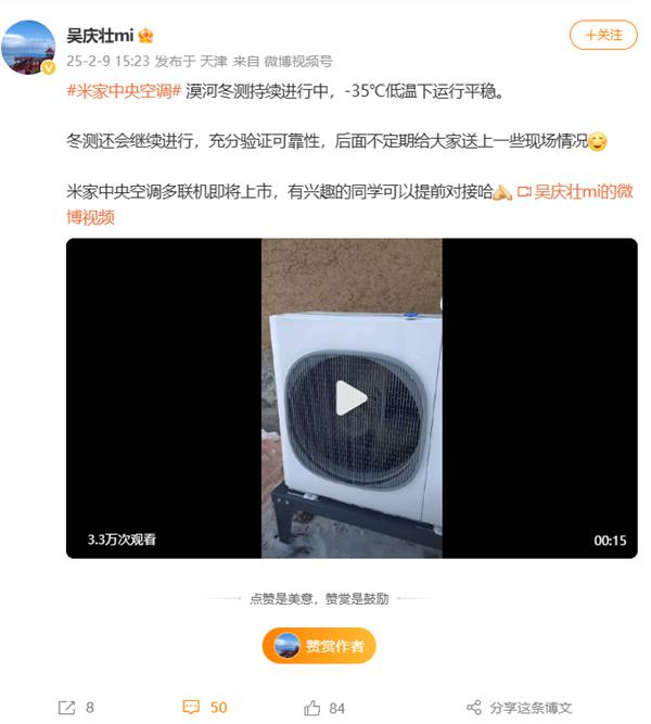 快科技 2 月 11 日前,小米集团家电部家用空调研发负责人吴庆壮发布了一段关于米家中央空调在漠河冬测的视频,称 -35 在低温下平稳运行,他透露米家中央空调多线即将上市。