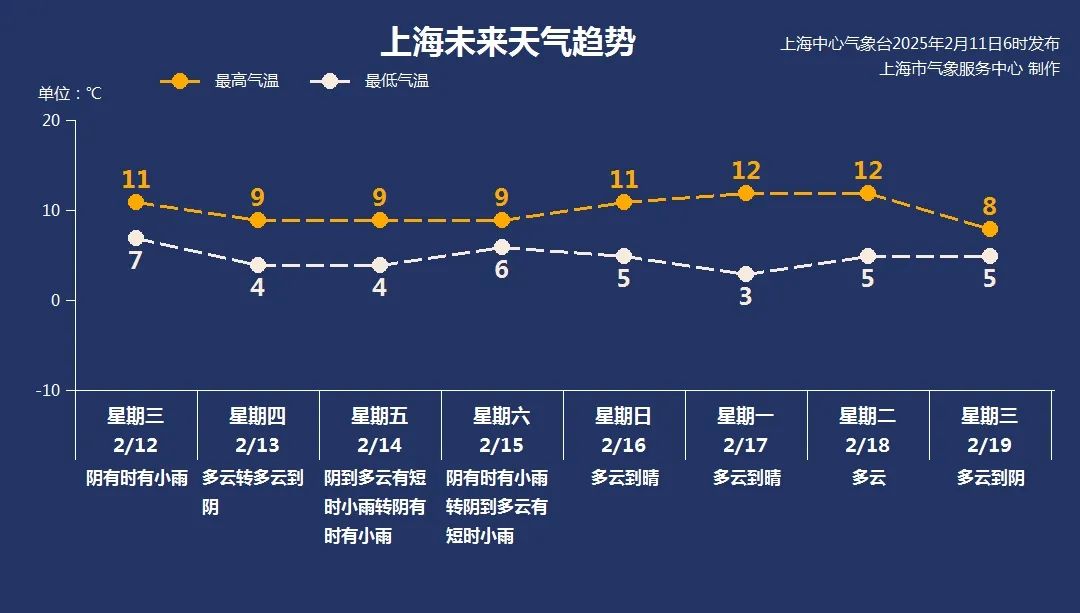 今日起暖湿气流(2月11日)加强,我国降雨范围扩大,中东部地区降雨量增加。上海转多云到阴部有短时小雨,晚上起雨比较明显,大家出行记得带上雨具,晚归要注意道路交通安全。东南风4~5级,中午起4~5级阵风6级,气温继续上升。早上城市温度在6℃周围,郊区基本在零度以上。最高温度回到两位数,估计可以达到12℃,相对湿度为90%。~50%的体验比较温暖湿润。