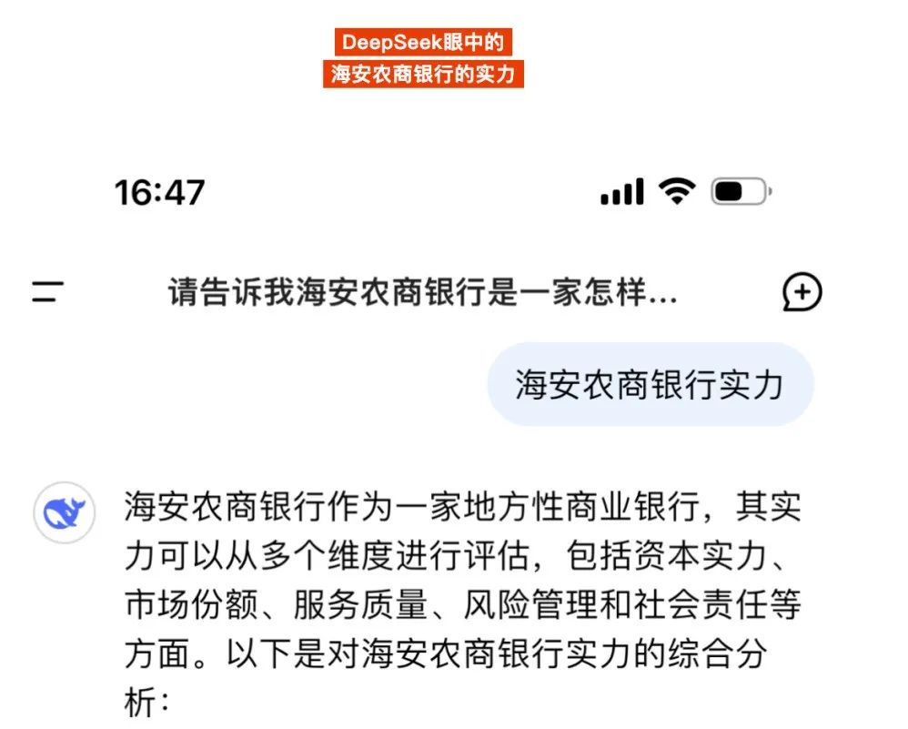 例如,一些银行在营销过程中使用了DeepSeek的功能。“DeepSeek,您也太了解海安农商银行了!“在海安农村商业银行最近发布的一份文案中,银行通过询问DeepSeek向客户介绍了银行的具体情况。在文案中,DeepSeek分析并总结了海安农村商业银行的资本实力、市场份额、服务质量、金融产品和社会责任。从银行的角度来看,业界认为DeepSeek最直观的使用场景将涵盖智能客户服务、客户需求挖掘、风险评估和管理等方面。