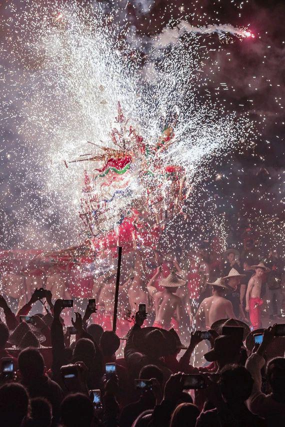“烧龙锣鼓响,心蓬厂;烧龙烟火,人们高兴。”潮汕揭阳的烟火魔龙遍体金光,在锣鼓和鞭炮的声音中畅游。