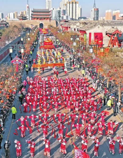 2月10日,农历正月十三,大同古城民俗社火灾巡游表演盛大开幕。精彩的表演,如抓架、旱船、雨伞和娃娃互动,为市民和游客带来了视觉盛宴。刘通 张占兵摄