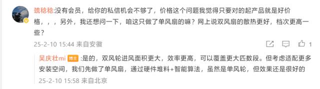 吴庆壮在另一条评论中谈到了单双风扇:“双风轮进风面积更大,效率更高,可以覆盖更大的数段。但是考虑到适应更多的安装空间,我们先做了一个单风扇,通过硬件堆放。 智能化算法,虽然是单风轮,但是效果还是不错的。