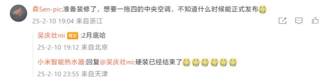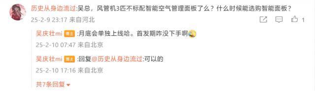 有人问,“一拖四”空调什么时候正式发布,得到吴庆壮的回复:2 月底。另一位网友询问了风管机 3 是否不标配智能气体管理面板,何时开放购买,回复称月底独立上线。