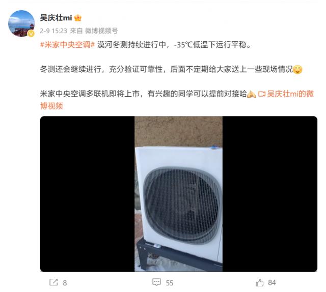 IT 世家 2 月 11 日消息,小米集团家电部家用空调研发负责人吴庆壮 9 日在微博上发布消息称,米家中央空调漠河冬测持续进行,-35 在低温下平稳运行,米家中央空调多联机将上市。