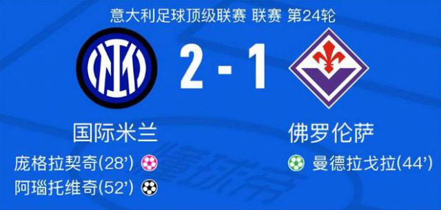 今天早上北京时间,意甲第一。 24 在一场强强对话中,国际米兰主场迎战佛罗伦萨。上半场,阿根廷锋霸劳塔罗的头球抢分导致庞格拉西奇乌龙,曼德拉戈拉点击扳平比分。下半场,奥古斯托助攻中超老将阿瑙托维奇头球破门。最后,国际米兰 2-1 击败佛罗伦萨。