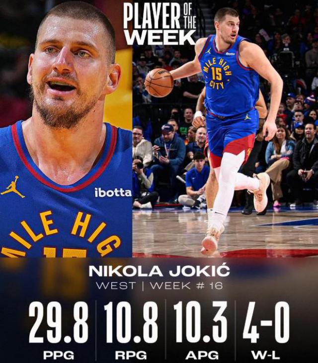 场均获得约基奇 29.8 分 10.8 篮板 10.3 助攻,掘金四战全胜。