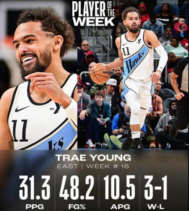 上周,特雷 - 杨场均得到 31.3 分 10.5 助攻,投篮命中率 带领老鹰获得48.2% 3 胜 1 负的战绩。