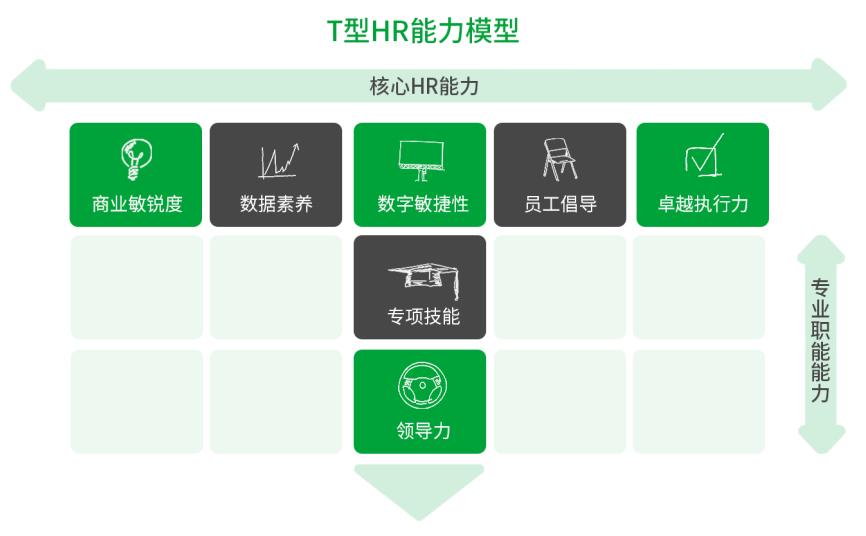 T型人力资源能力模型的核心思想是人力资源人才需要具备“T型”能力才能更好地担任相关职位。所谓“T型”,不仅要充分考虑五大核心HR能力——商业敏锐度、数据素养、数字敏捷性、员工提倡和优秀执行力,还要在至少一个行业领域有深度的专业化(具体专业化取决于岗位或公司的需求)。