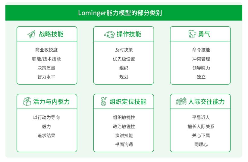 Lominger能力模型识别了67项关键技能、行为和特征,包括思维模式、人际交往、自我约束和成果实现等。在组织的各个岗位上高效完成工作。这个模型在领导力培训、接任规划、绩效管理等方面得到广泛应用。