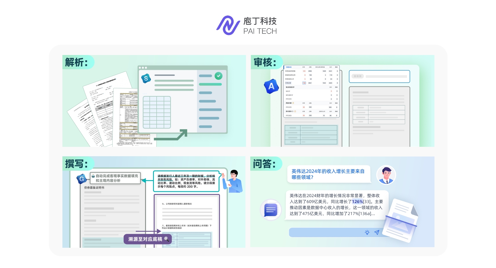 成立于2017年的怼丁科技一直专注于此智能文档领域,致力于解决公司文档处理中的效率和风险控制问题。其自主研发文档分析技术可以有效分析复杂的布局文档,提取非结构化数据,帮助企业探索非结构化文档中的深层价值。 当前,丁丁科技推出的文档智能解决方案覆盖面文件分析,智能审核,智能编写,智能问答等待整个过程,商品在准确度和稳定性各方面都处于行业领先水平。
