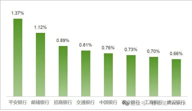 其次是渤海银行、浙商银行、华夏银行、交通银行,占比超过65%,另外两家银行占工行和民生银行的60%以上。邮政储蓄、招商银行和平安是公司贷款比例最低的,都是40%出头的,也是业内公认的零售银行。