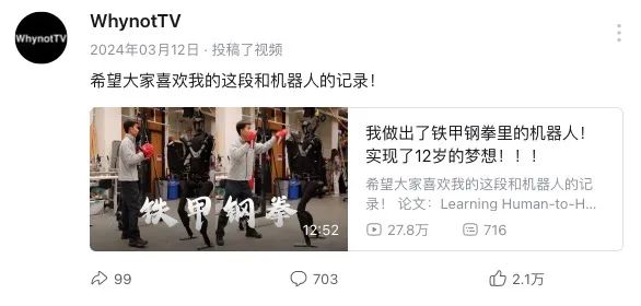 哦,对了,最后还有一个鸡蛋:今天这篇论文的主要作者,英伟达 GEAR 目前在卡内基梅隆大学学习的团队成员哔哩哔哩up主何泰然,当他还是个孩子的时候,他的梦想真的就是在电影《铁甲钢拳》中制作一个机器人(设置为人类操纵机器人拳击)。