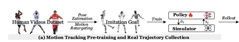 再次通过一个名字 TRAM 运动重建工具,将视频中的人类动作全部拉出,转化为三维运动轨迹,使机器能够理解这些动作;然后把这些动作放在虚拟环境中进行训练,目的是使机器人能够准确地模仿视频中的动作数据。