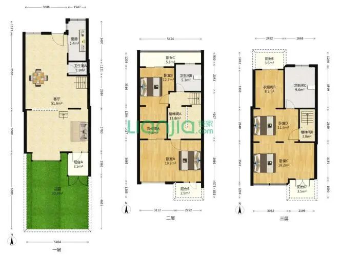 比如这个175平的联排别墅:一般三层,每层一个卫生间,最大的接近10平米,但厨房还是只有熟悉的数字。5.4平,就像最初提到的87平小户型厨房一样大!