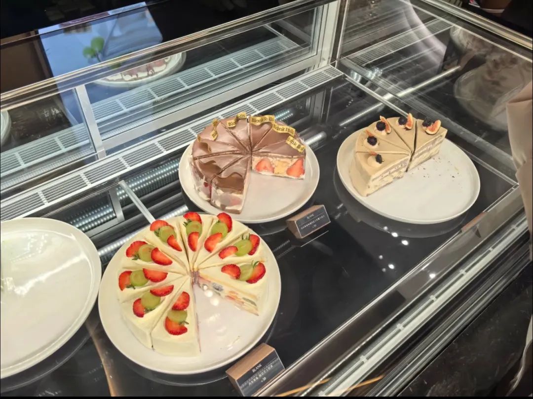 销售蛋糕的过程中,顾客可以看到店里的工作人员还在厨房做蛋糕。14:00-15:00,蛋糕陆续加到柜台。有趣的是,一个整个蛋糕通常可以做10个角,但一个名为“抹茶柚子”的蛋糕每次只在柜台上切3个新角。店长告诉茶咖观察,这是因为“如果使用高浓度抹茶,蛋糕的颜色会发生变化,如果在柜台光线下超过半小时,会影响形状。最后,这三块蛋糕在搬出厨房的第一时间就被抢走了。