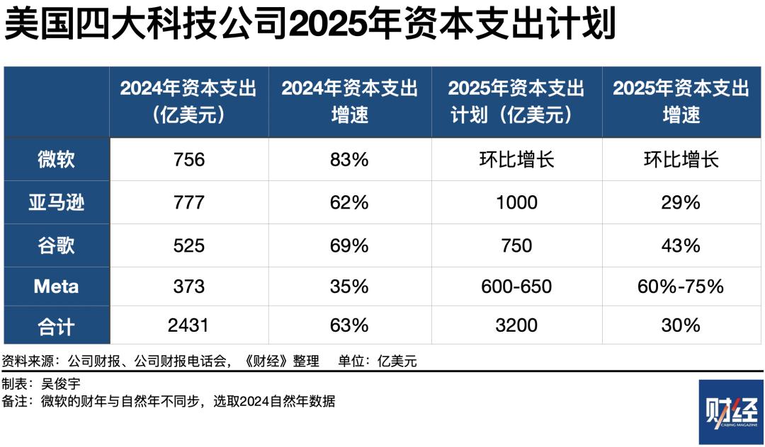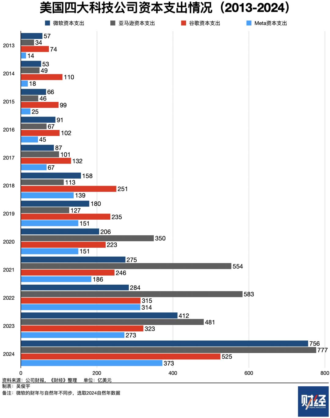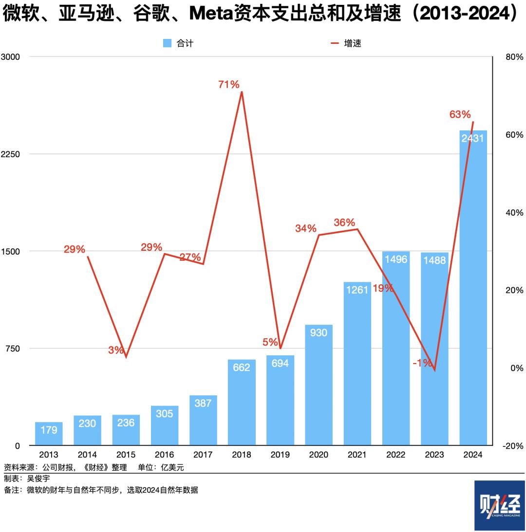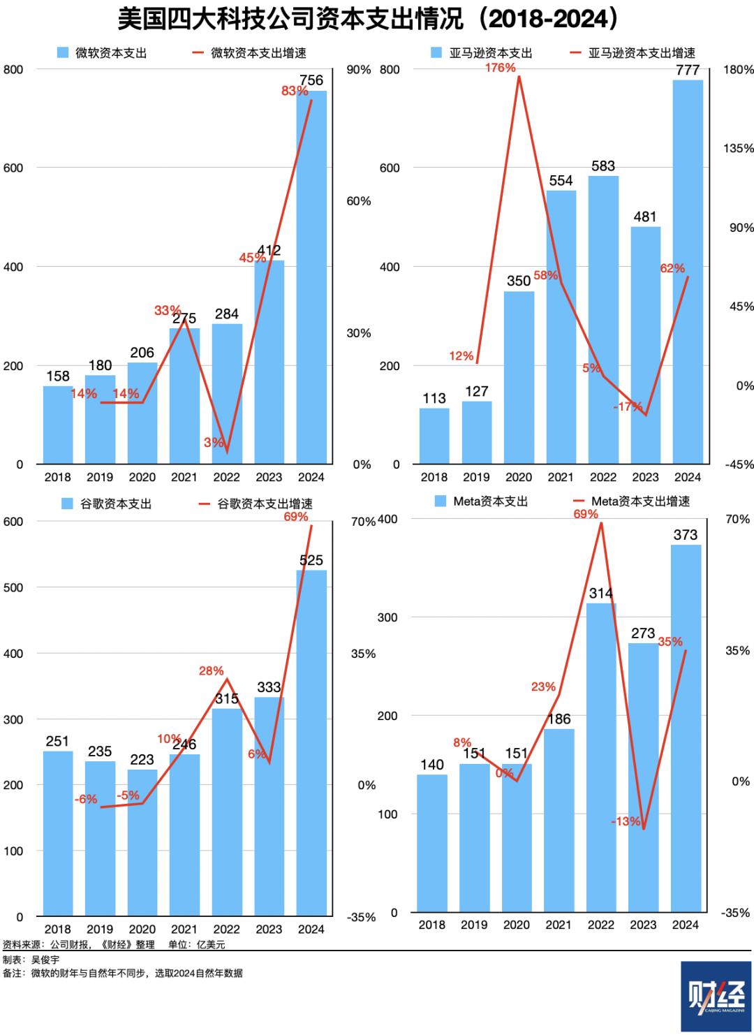 2024年,美国科技四巨头的资本支出达到历史最高水平。 最近的财务报告显示,微软,亚马逊,谷歌,Meta 2024年资本支出分别为756亿美元、777亿美元、525亿美元和373亿美元,同比增长83%。、62%、63%、35%。2024年,这四家公司的资本支出总额为2431亿美元(约合1.8万亿元),同比增长63%。