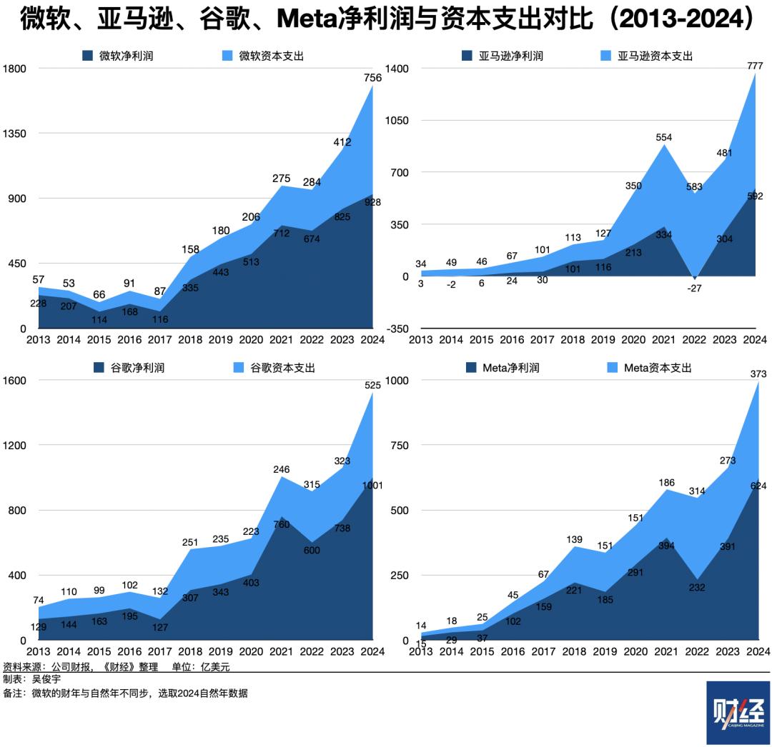 即使在2024年高韧性资本支出之后,这四家科技公司的账户仍然盈余了数百亿甚至数千亿美元的净利润,净利润仍在增长。2024年,微软净利润928亿美元,同比增长12%。;亚马逊净利润592亿美元,比去年同期增长94%;谷歌净利润1001亿美元,比去年同期增长36%;Meta净利润624亿美元,同比增长60%。