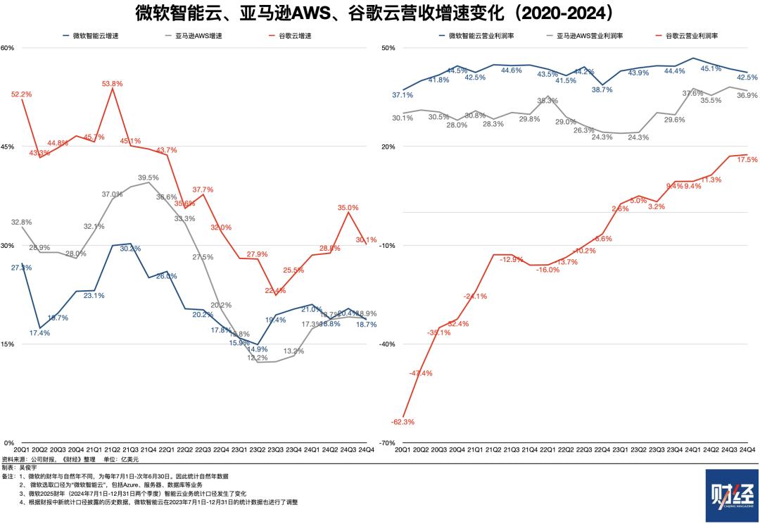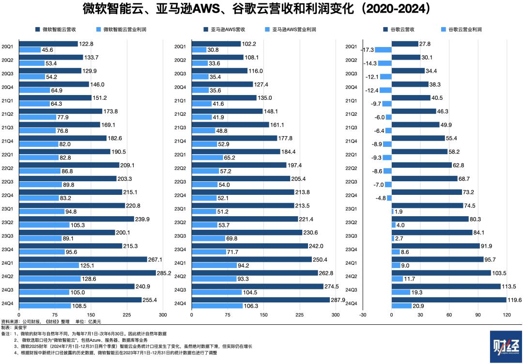 微软管理层透露,其计算费用是市场需求驱动的。截至2024年第四季度,微软AI业务年化收入超过130亿美元(年化收入是云公司的统计口径,是季度收入的4倍。云公司客户一般按年/季/月订阅,履约工作稳定。所以这种统计方法被广泛接受),同比增长175%。根据《财经》的统计,2024年微软智能云的收入为1054亿美元,其AI业务占云业务收入的12.3%。换言之,短短两年,微软的AI相关业务已经初具规模。