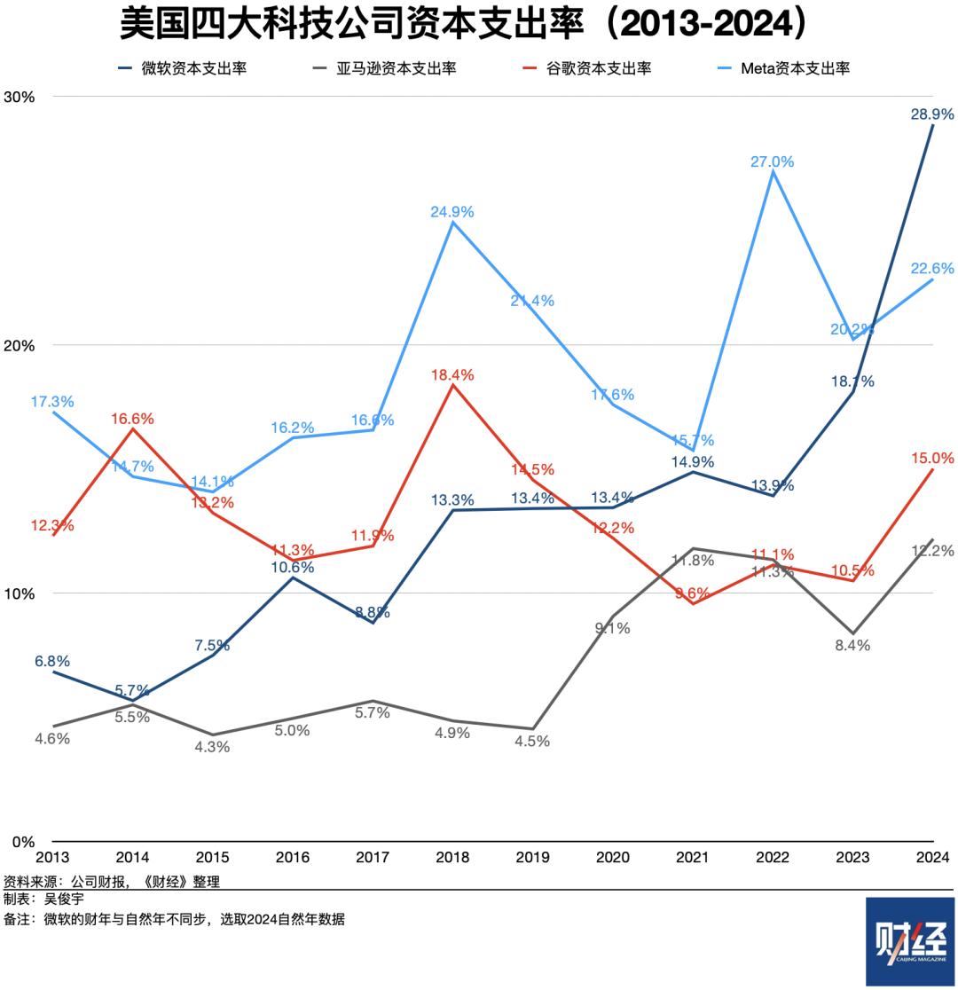 财经对微软、亚马逊、谷歌、Meta四家美国科技公司近20年的资本支出进行了统计(图表仅显示2013年后的数据)。2024年,这四家公司的资本支出达到了历史最高水平。