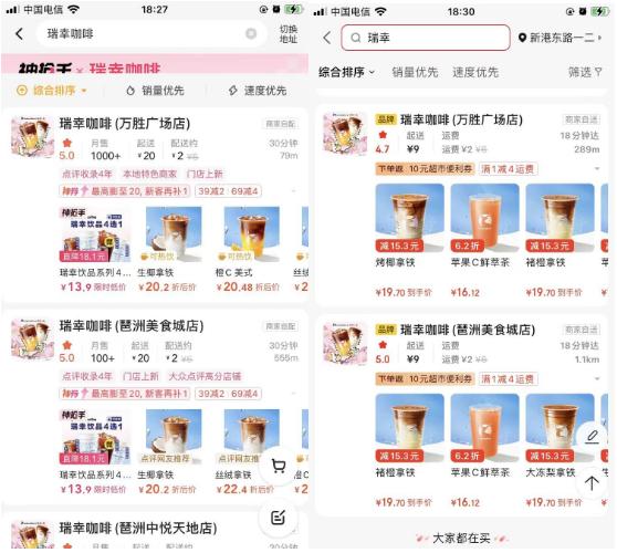 值得注意的是,同一家商店在JD.COM秒发送的产品价格和发货金额将低于其他外卖平台。比如瑞幸咖啡(万胜广场店)也是其店铺的招牌产品生椰拿铁。JD.COM秒发的价格是18.8元,美团外卖的价格是20.2元,JD.COM秒发的店铺整体发货额度较低。
