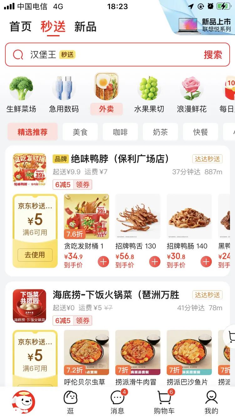 以广州为例。当你进入JD.COMAPP时,“秒送”一栏已经出现在页面顶部。点击查看后,会出现超市方便、咖啡奶茶、生鲜菜市场、外卖等导航栏。其中,“咖啡奶茶”和“外卖”两个品类,都可以跳转到餐饮企业。