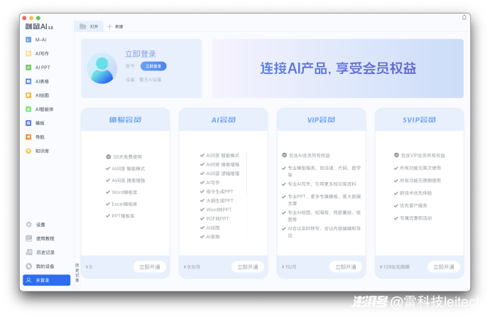 传单上,咪鼠为M5。 AI鼠标赋予了6个通用模型和3个专业模型。经过一番研究,小雷发现了这个DeepSeek鼠标的逻辑。简而言之,鼠标上的AI键可以一键拉上电脑安装咪鼠AI键。 3.0软件。与罗技Logi不同 Option 或者雷蛇Synapse雷云这类设备管理软件,咪鼠AI 3.0更像是一个内置AI入口WPS,包括写作,PPT、在保留语音控制能力的同时,表格、制图、智能体等多种功能。