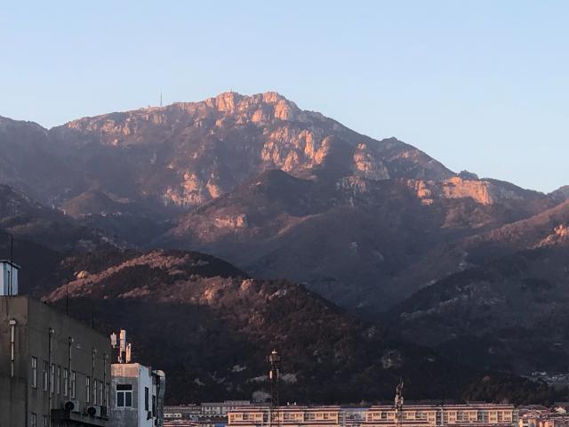 又往前走了 1 一个半小时后,我来到泰安。因为明天还是假期,我不急着上路,就下了高速进城,在岱庙周围找了一家酒店。那天天气很好。坐在房间里,可以欣赏泰山、岱顶、天街、南天门的全景,清晰可见。