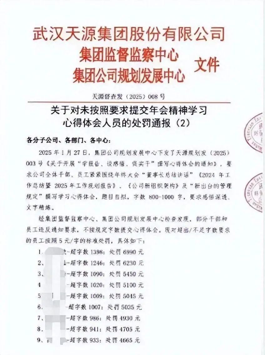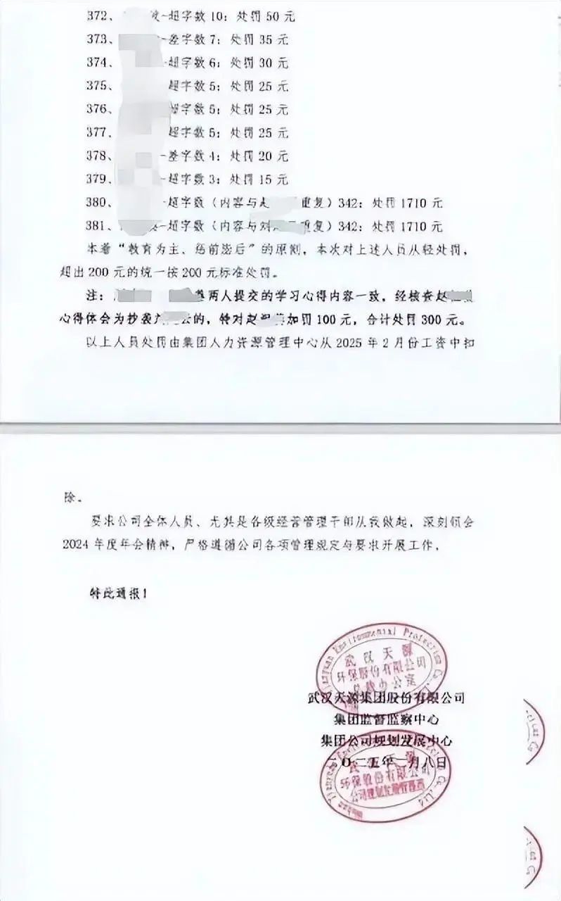 近日,湖北武汉一家环保公司内部的《处罚通知》在网上流传,提到员工写800到1000字的经历,重点是“年终大会董事长总结讲话”。字数超过/字数不足的员工,按照5元/字的标准进行处罚,引起关注。