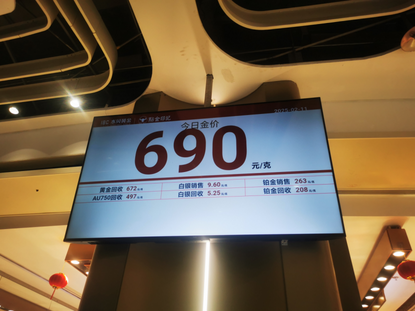 “早上黄金价格涨到694,下午跌回688元,现在涨到690。我们也以为年后价格会降低,没想到会涨这么多。这是我从业以来看到的最高价格。黄金价格上涨后,我们的购买成本也高了。”水贝某金店店员告诉记者。