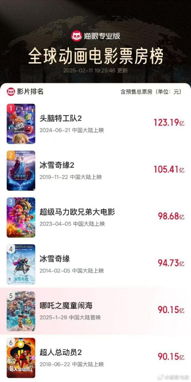 现在《哪吒魔童闹海》累计票房(包括预购)已经达到 90.15 十亿,超人总动员 二是票房成绩,进入全球动画电影票房榜前五。
