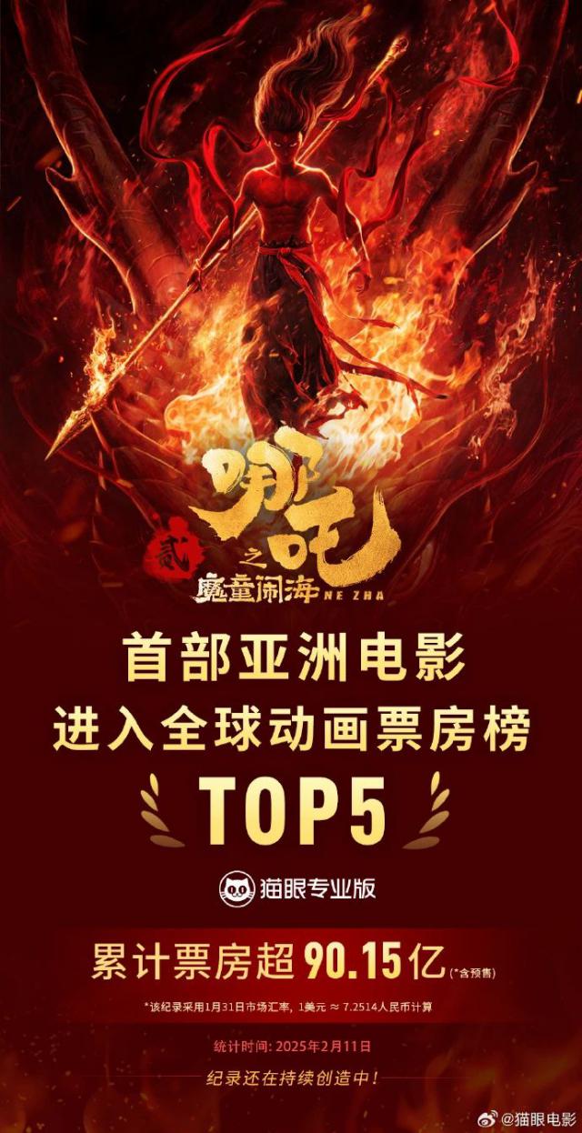 根据最新数据,哪吒 已成为全球票房的全球票房 TOP30 唯一一部非好莱坞电影,预计将影响世界电影史前七。