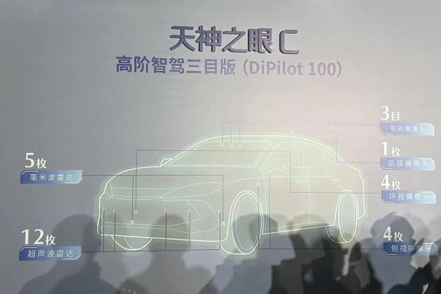 天神之眼 C 实际上是过去的 DiPilot 100,采用纯视觉智能驾驶方案,配置英伟达 Orin N 芯片,算率 84 TOPS,整车 12 一个摄像头,前面的感知摄像头是三目摄像头。