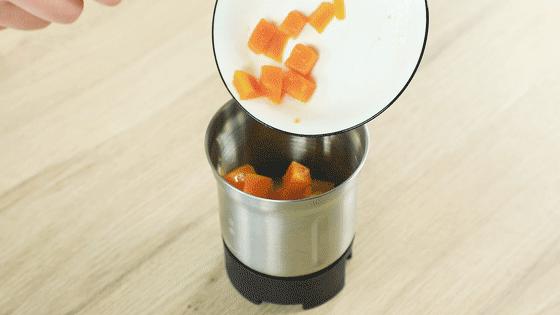 将蒸好的南瓜块和配方奶倒入湿磨杯中,