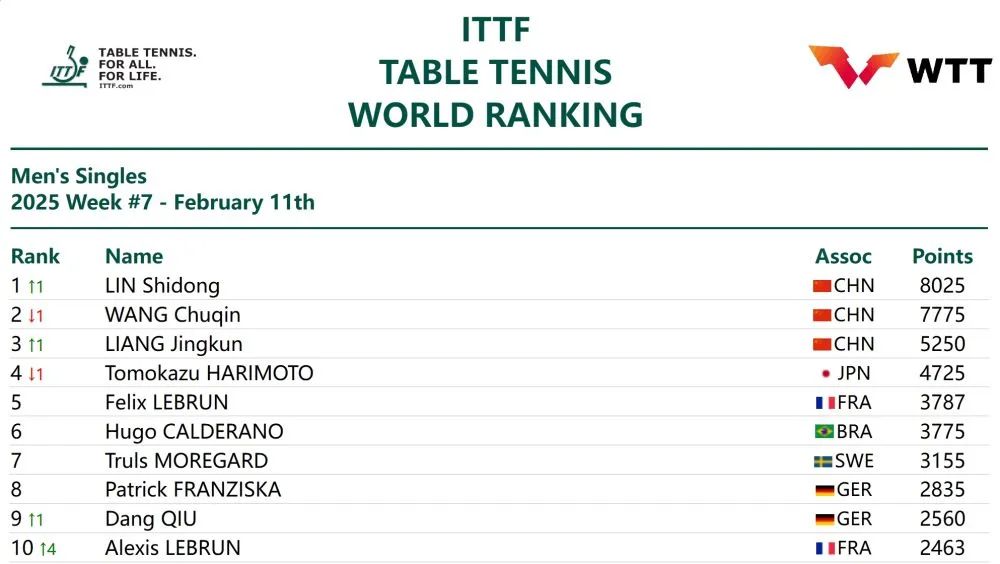 2月11日,国际乒乓球联盟公布了最新的全球排名。世界乒乓球职业联盟(WTT)中国选手林诗栋超越队友王楚钦,在新加坡大满贯赛中获得2000分,位居世界第一。