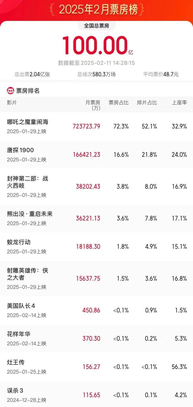 根据网络平台的数据,2025年2月11日14时28分,2025年2月票房(含预购)突破100亿,暂列单月票房榜第七名,《哪吒魔童闹海》票房占比超过72.3%,强势领先2月票房榜!
