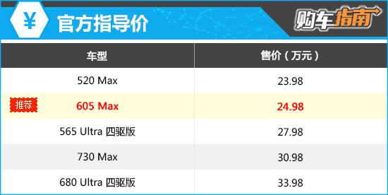 参考价为 24.98 万元的 605Max 这是这次推荐的车型。通过配置对比可以看出,推荐车型比入门级车型增强了。 85km 纯电续航里程,提升到 605km。此外,还增加了全车电动吸入门、投射感应打开后备箱、方向盘加热等功能,可有效提高日常常见车辆的舒适性和便利性。而且价格只比入门版多出来。 10000 人民币,绝对物超所值,性价比极佳。
