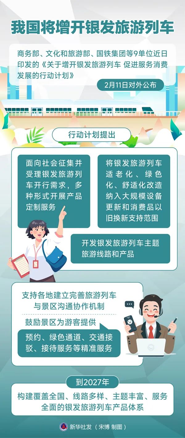 ◆ 近日,商务部等9单位发布了《关于增加银发旅游列车的发展》 11日公布了促进服务消费发展的行动计划,提出了12项具体措施,包括增加银发旅游列车服务供应和加强老化设施保障。