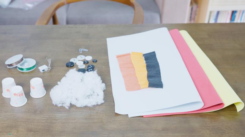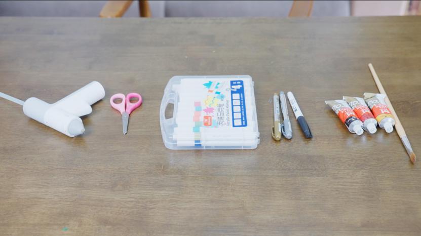 圆形纸管,扣子,丝线,棉花,橡塑纸,装饰纸,灯带,胶枪,剪刀,马克笔,水笔,丙烯油,画笔,