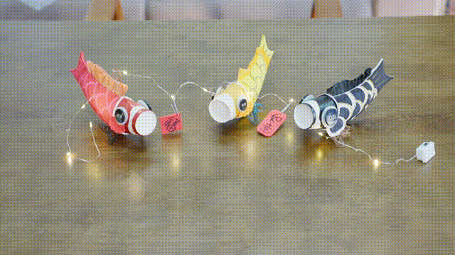 4.重复以上步骤,制作不同颜色的锦鲤鱼,用丝线盘绕,可以写福字作为装饰,最后用灯带连接,一个闪亮生动的“锦鲤鱼”灯串就完成了!