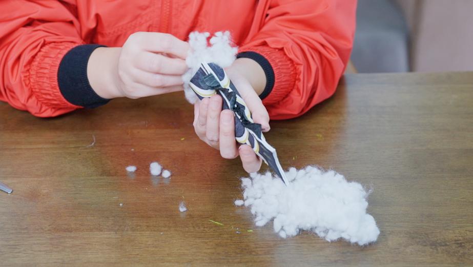 3. 粘贴相同对称的两条鱼的边缘后,用棉花填充身体,最后在开口处粘贴鱼头,用装饰纸和纽扣做成鱼的胸鳍和眼睛。