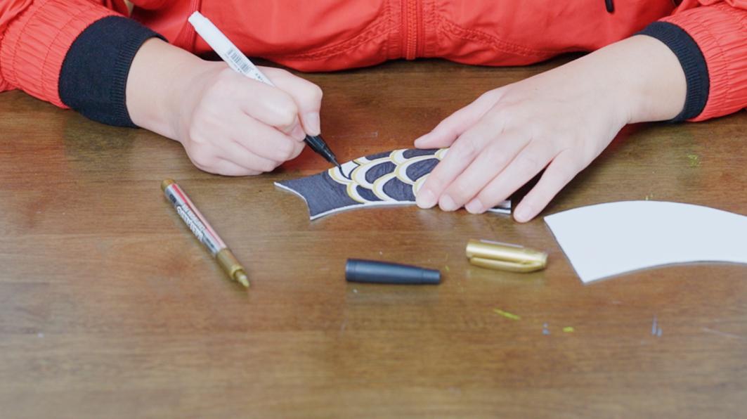 2. 剪下锦鲤鱼的形状,用马克笔画出鱼鳞和鱼尾,用橡塑纸剪出波浪形的背鳍,贴在鱼背上。