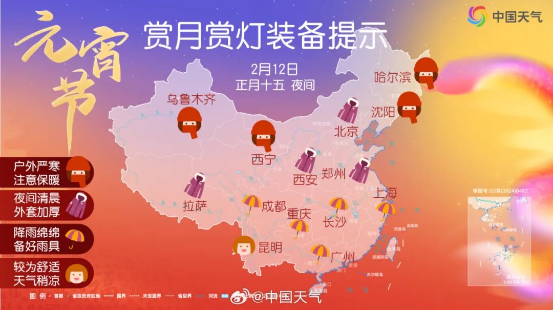 气候提醒:月朦胧雨朦胧,有出门赏灯游玩计划的朋友,记得带上雨具穿上暖和的衣服,旅行时要注意安全。