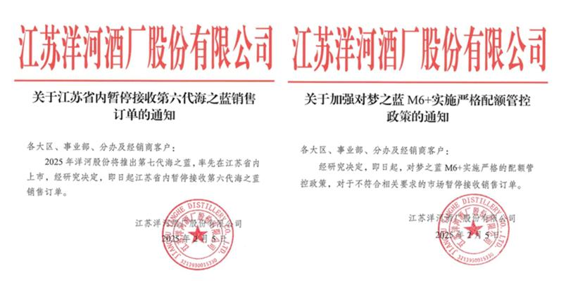 一方面,发布关于加强对梦之蓝 M6+实施严格配额管控政策的通知,决定即日起对梦之蓝 M6+实施严格配额管控,不符合相关要求的市场暂停接收销售订单;另一方面,鉴于 2025 年洋河股份将率先在江苏省内推出第七代海之蓝,江苏省内自通知发布起暂停接收第六代海之蓝销售订单。而早在年前 1 月 17 日,洋河就已决定即日起停止向各线上平台供货海之蓝、天之蓝产品。